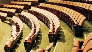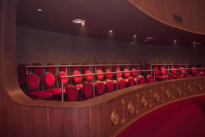 Acústica de excelencia con alfombras especiales, paredes y cielo raso revestidos con lana de vidrio, goma espuma y madera, optimizando la acústica. Butacas estilo época: Confeccionadas con pana especial,